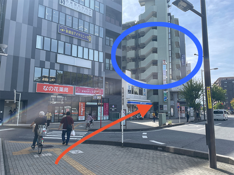⑦斜め右に「LAWSON」が見えます。その右隣に建ってる緑色のマンション(セントエルモ新越谷)の503号室が当店になります。